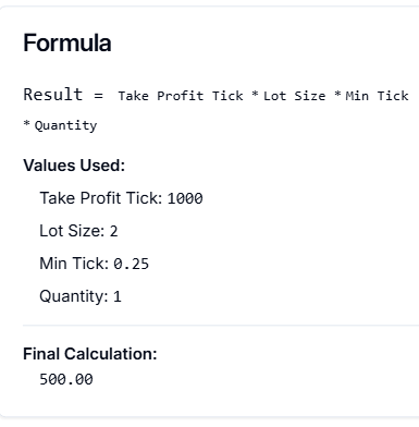 Formula:Result = Tick Count × Lot Size × Min Tick × Quantity